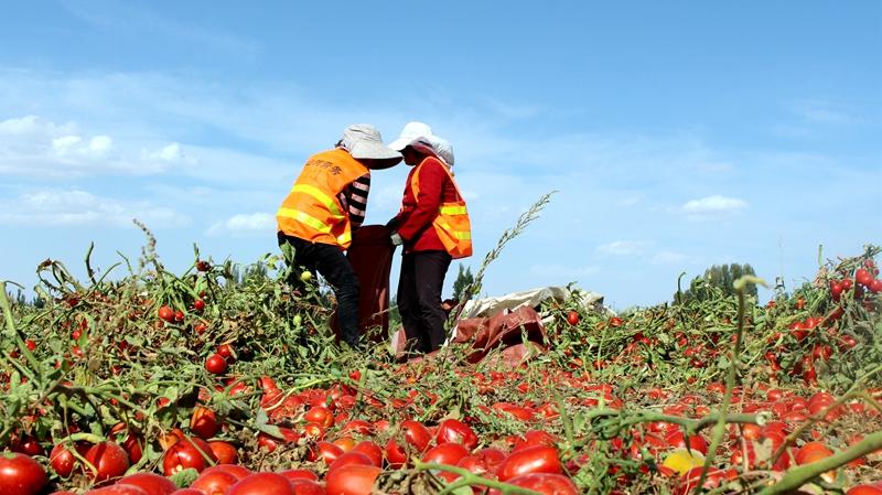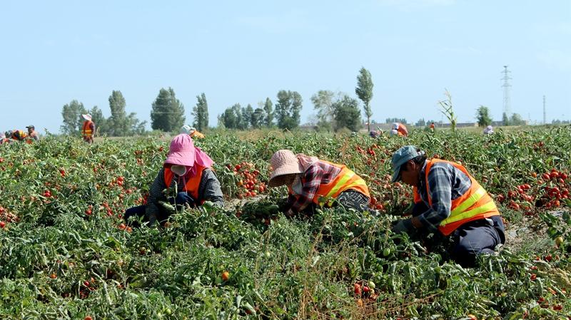 “我今年在湾子村流转土地种加工番茄,番茄长势特别好,产量高,每亩地产8吨不成问题。”番茄种植基地负责人李付增介绍说,“这两天我找了200个工人,大概一周就能采收完。”