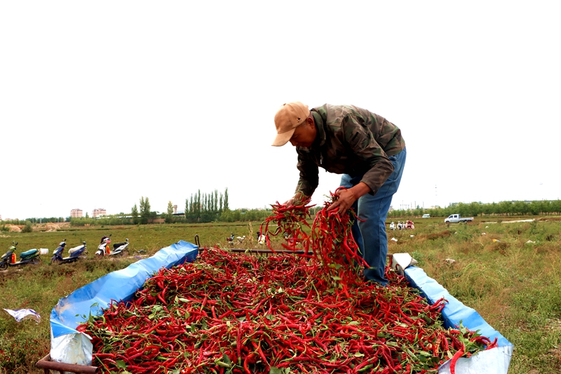 “今年是我家第一次种植辣椒,通过流转土地共种植了55亩,种了16亩线椒,其他都种的是朝天椒。按照年初签订种植合同,每公斤干辣椒10元,一亩地平均能收400~500公斤,除去地租、水肥、人工支出,一亩地能收入2000元左右,比种植玉米赚得多。”张玉霞一边带领工人采收辣椒,一边算着“收入账”。