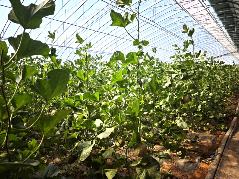 “我们的蜜瓜基地走的是全程标准化种植路子,你看这瓜的网纹、个头,全按统一标准培育,品质个个拔尖,再过半个月就能上市!”古寨村党总支书记李磊国指着瓜藤上的蜜瓜介绍到。依托科技赋能,基地实现了蜜瓜种植的精准化管理:智能滴灌系统按需调节水肥,物联网设备实时监测作物长势,绿色防控技术全程守护品质。每一颗待熟的蜜瓜,都是现代农业技术在盐碱地上结出的“科技硕果”。