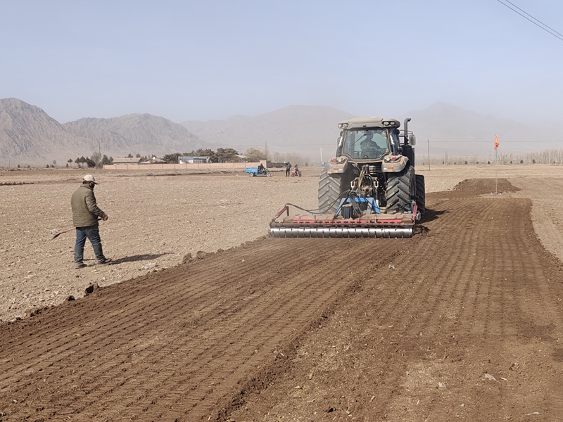 “我驾驶的是犁旋一体机,前面是犁铧,后面是旋耕机,一遍走过去既完成了土地深松,又粉碎了大块泥土和根块,再被刮板一刮,土地平整,土质疏松,等过几天就直接可以覆膜保墒等待播种了,比以前单一的机械省事多了。”临泽县耘野农机服务专业合作社负责人白晓鹏介绍道。
