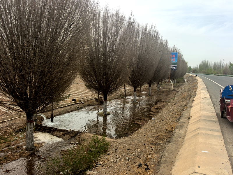 在各村农田林网建设点及黑河大林带沿线,新栽植的杨树、柳树、沙枣等苗木错落有致、整齐排列,定植后第一时间统一浇灌定根水。技术人员全程现场指导,严格把控栽植密度、定干高度、树干涂白三大关键环节,所有新植苗木同步完成涂白防护,有效防虫抑菌、防风抗旱,全力实现“栽一棵、活一棵,植一片、绿一片”的目标。
