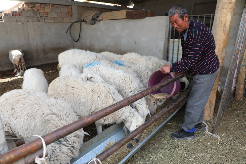 同样,在明泉村养殖场,绿树环绕,周围环境干净整洁,羊儿的“咩咩”声此起彼伏。庞有胜正在给羊添加饲料,他笑着说:“现在我的圈里有40多只羊、2头牛、4只鸡,我准备过几天要再卖20只羊左右,我一年养羊的收入也挺好。我们老两口现在身体也健康,今年打算把圈养满超过100只羊,以后的日子会越过越好。”