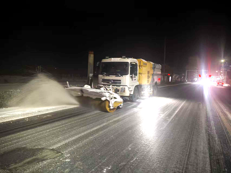 晚8时许,停止降雪后,第一时间迅速行动,利用现有的大型扫雪车,连夜对人流、车辆相对密集的滨河路、县府街、自由路等城区主干道开展路面积雪清除工作。养护人员顶风冒雪,按照“先近后远、先通后净”作业原则,奔赴县乡主干道、急弯陡坡等重点路段,清理路侧积雪,用脚步丈量安全,用坚守抵御严寒。轰鸣的机械声打破冬日沉寂,忙碌的“橙色身影”成为冰雪中最安心的路标,用责任与速度守护着干线公路的“生命线”。截至24日10时,县交通运输局出动养护人员56人次,撒布融雪剂1吨,防滑砂64处、130立方米,清除积雪150余公路里。