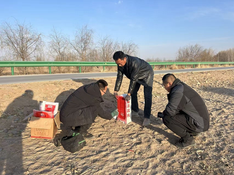 作业现场,一派繁忙有序景象。工作人员分组协作,有的挥锹培土,扶正加固倾斜的桩体;有的细心擦拭,洗去沉积的尘垢;更有“画师”执刷,蘸取鲜红油漆,一笔一画重描“临泽农水”“禁止破坏”等字样。红漆映着冻土,新字格外醒目。短短数日,60余处标识桩焕然一新,犹如被重新唤醒的哨兵,静立地头,守望渠系。
