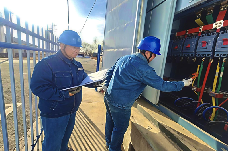 节后的临泽县公交站车辆往来穿梭,候车群众络绎不绝,处处涌动着复苏活力。在繁忙景象背后,一抹“国网蓝”坚守一线、格外醒目。工作人员范天生、宋正曌身着工装、头戴安全帽,手持钳型电流表等专业设备,对站内配电柜、线路接头及电缆终端精准“把脉”。大家仔细检测设备运行温度,逐项核对运行参数,全面排查潜在安全隐患,做到不漏一项、不留死角。