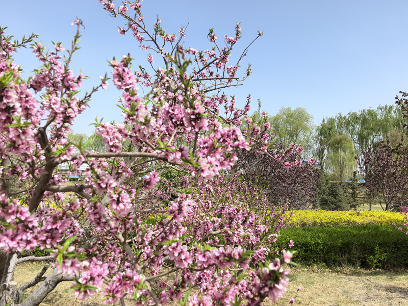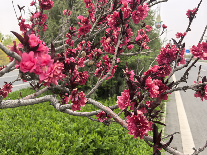 滨河路延伸段是临泽春日赏花的核心打卡点,两侧绿化带已然成为城市最亮眼的风景带。西府海棠缀满粉白花朵,花瓣层层舒展;红宝石海棠嫣红似火,明艳动人;桃花迎着暖阳绽放,花团锦簇。郁郁葱葱的乔木撑起浓密绿荫,与繁花相映成趣,微风掠过,花瓣簌簌飘落,空气中弥漫着淡淡花香。不少市民扶老携幼,在花丛边架起相机、手机,定格春日美好;孩子们在树荫下追逐嬉戏,欢声笑语为美景增添了鲜活气息,不少游客感慨:“临泽的春天,藏在每一条道路的风景里。”