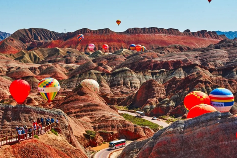 天还泛着蟹壳青,我们就已经站在观景台上了。风从山谷的豁口里钻出来,凉飕飕的,是那种夜里攒下的寒气,可里头又混着一股子味儿——特别干爽,像是从地底下岩石缝里透出来的。几个老伙计裹紧了冲锋衣,颜色不一地靠在栏杆边儿上,谁也不说话,就静静地望着前头那片山。丹霞还在阴影里睡着呢,黑压压的一大片。它像一本合了不知多少万年的旧书,用铁和火写的,厚墩墩的;那些说不清道不明的故事啊传奇啊,全都给封在那些硬邦邦,皱巴巴的山褶子里头了。