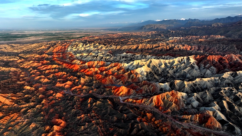 一个霞光熹微的早晨,走进临泽丹霞,抬眼望去,远方的山峦,被染成一抹浅金,像一幅尚未干透的水彩,赤橙黄绿的岩层,藏着几分含蓄,几分神秘。“色如渥丹,灿若明霞”,古人的笔触终究道不尽眼前的壮阔,唯有亲临这片土地,方能读懂丹霞与天地共生的秘密。