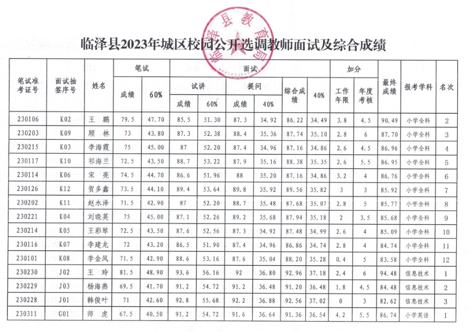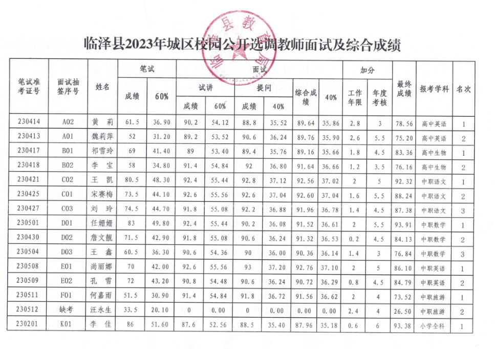 根据《临泽县2023年城区校园公开选调学科教师及生活指导教师的公告》,县教育局、县人社局于2023年8月16日组织面试入围考生进行了现场面试,现将面试及综合成绩予以公示。