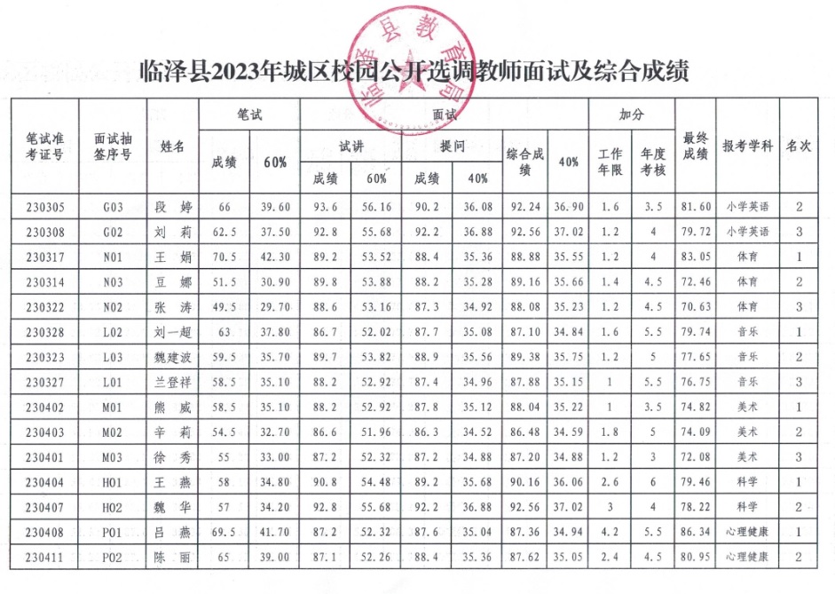 临泽县2023年城区校园公开选调学科教师面试及综合成绩公示