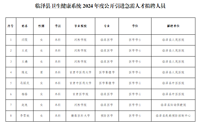 根据中共临泽县委组织部、临泽县人力资源和社会保障局《关于临泽县2024年公开引进急需人才公告》要求,经报名、资格审核、面试、资格复审、体检、考察等程序,闫霞等8名同志确定为临泽县卫生健康系统2024年度公开引进急需人才拟聘人员(人员名单附后),现予公示,接受社会各界监督。公示期间,可通过电话、来信、来访等方式举报反映问题。