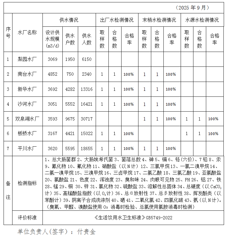 为掌握我县农村生活饮用水水质安全及卫生动态变化状况,依据《生活饮用水卫生标准》GB5749-2022,我单位于2025年9月对6处农村饮水集中式供水工程,12个检测点的生活饮用水进行采样检测,检测结果接受社会各界和广大农村居民的监督,具体监测情况详见附表。