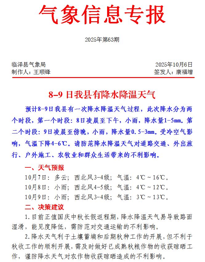2025年10月6日气象信息专报(第63期)-8-9日我县有降水降温天气