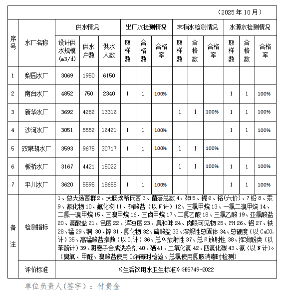 为掌握我县农村生活饮用水水质安全及卫生动态变化状况,依据《生活饮用水卫生标准》GB5749-2022,我单位于2025年10月对6处农村饮水集中式供水工程,12个检测点的生活饮用水进行采样检测,检测结果接受社会各界和广大农村居民的监督,具体监测情况详见附表。