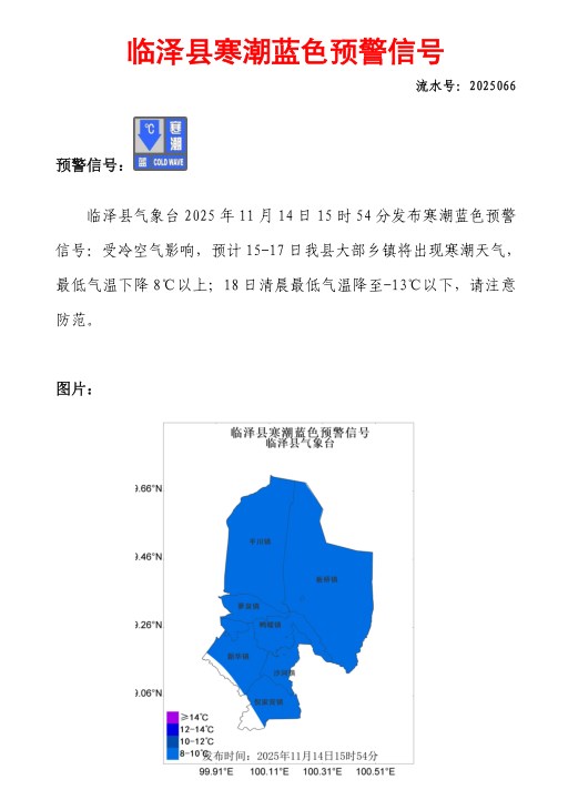 临泽县气象台2025年11月14日15时54分发布寒潮蓝色预警信号 (发布)(2025066)