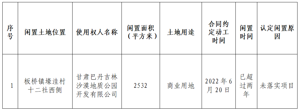 依据《中华人民共和国土地管理法》《闲置土地处置办法》(国土资源部第53号令)相关规定,以下宗地存在超过国有建设用地使用权出让合同约定的动工开发日期满两年未动工开发的情况,我局根据调查认定情况,向土地使用权人下达了《闲置土地认定书》,现将闲置土地情况公示如下: