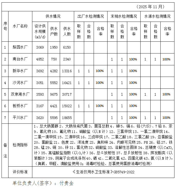 为掌握我县农村生活饮用水水质安全及卫生动态变化状况,依据《生活饮用水卫生标准》GB5749-2022,我单位于2025年11月对6处农村饮水集中式供水工程,12个检测点的生活饮用水进行采样检测,检测结果接受社会各界和广大农村居民的监督,具体监测情况详见附表。