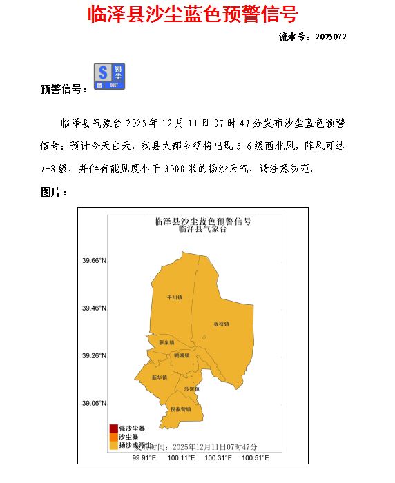 临泽县气象台2025年12月11日07时47分发布沙尘蓝色预警信号(发布)
