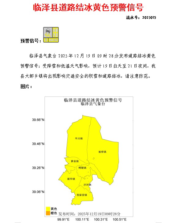 临泽县气象台2025年12月19日09时28分发布道路结冰黄色预警信号(发布)(2025075)