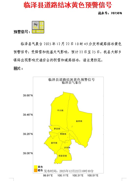 临泽县气象台2025年12月22日10时49分发布道路结冰黄色预警信号(发布)(2025076)