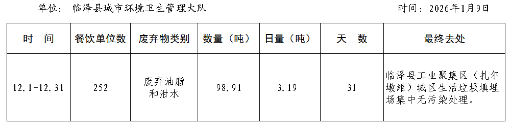 为认真贯彻落实临泽县人民政府《关于禁止使用餐厨剩余物(泔水)饲喂生猪的通告》精神,切实做好城区范围内各餐饮经营单位餐厨剩余物的收集、运输和处置工作,推进全县餐厨剩余物无害化处理,现将2025年12月份餐厨废弃物收集处理情况公示如下: