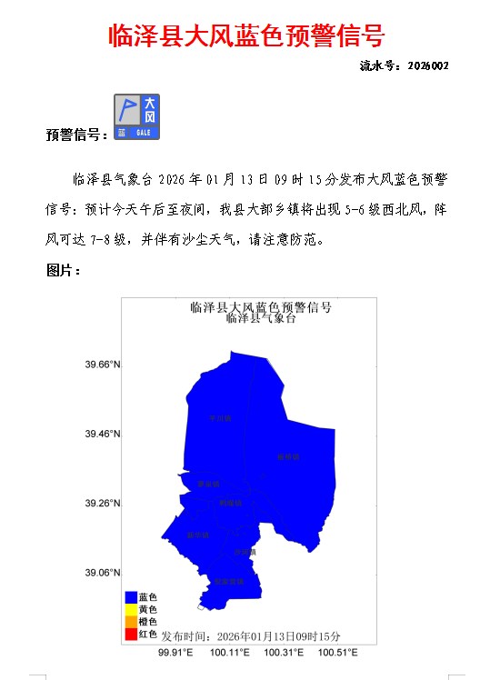 临泽县气象台2026年01月13日09时15分发布大风蓝色预警信号(发布)(2026002)