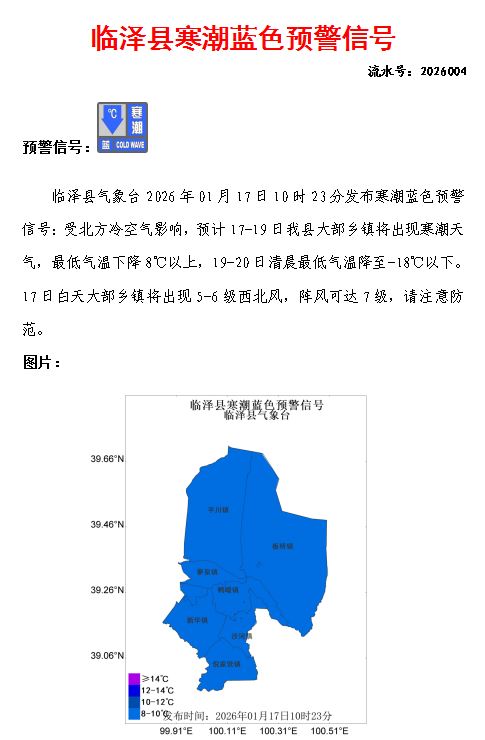 临泽县气象台2026年01月17日10时23分发布寒潮蓝色预警信号 (发布)(2026004)