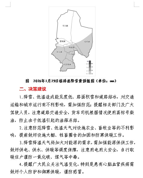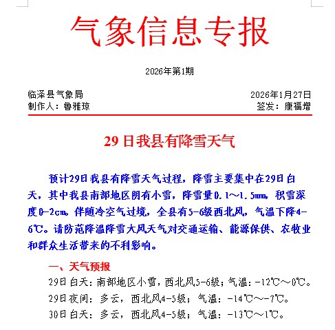 2026年1月27日气象信息专报(第1期)-29日我县有降雪天气