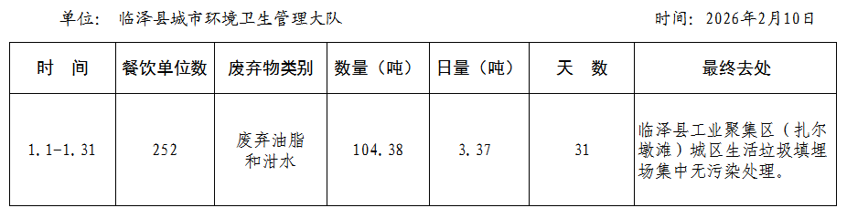 临泽县2026年1月份餐厨废弃物收集处置公示