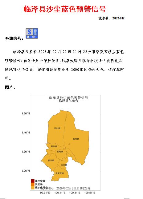 临泽县气象台2026年02月21日11时22分继续发布沙尘蓝色预警信号(确认)(2026012)