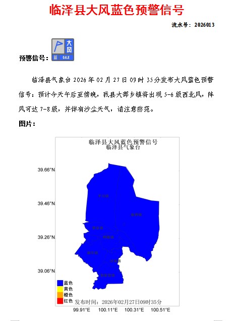 临泽县气象台2026年02月27日09时35分发布大风蓝色预警信号(发布)(2026013)