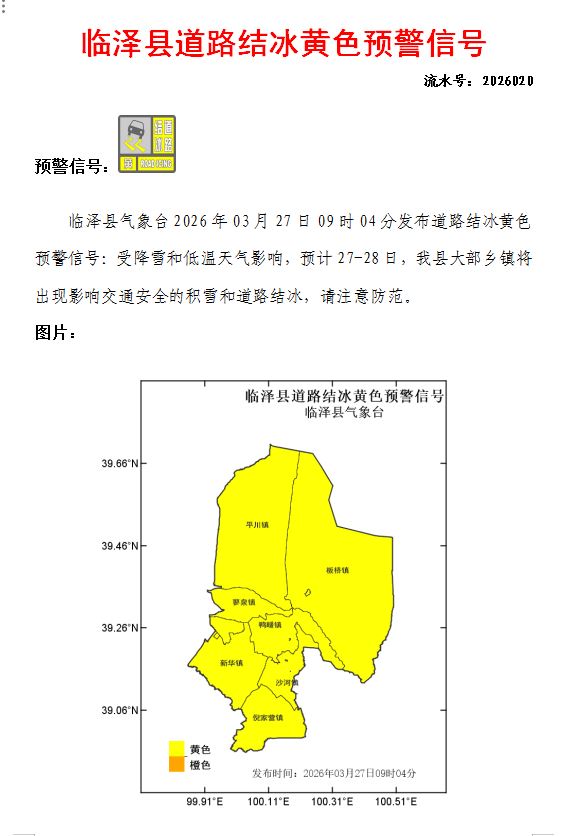 临泽县气象台2026年03月27日09时04分发布道路结冰黄色预警信号(发布)(2026020)