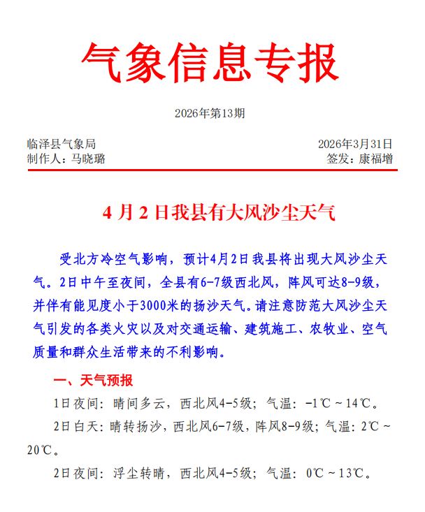 2026年3月31日气象信息专报(第13期)-4月2日我县有大风沙尘天气