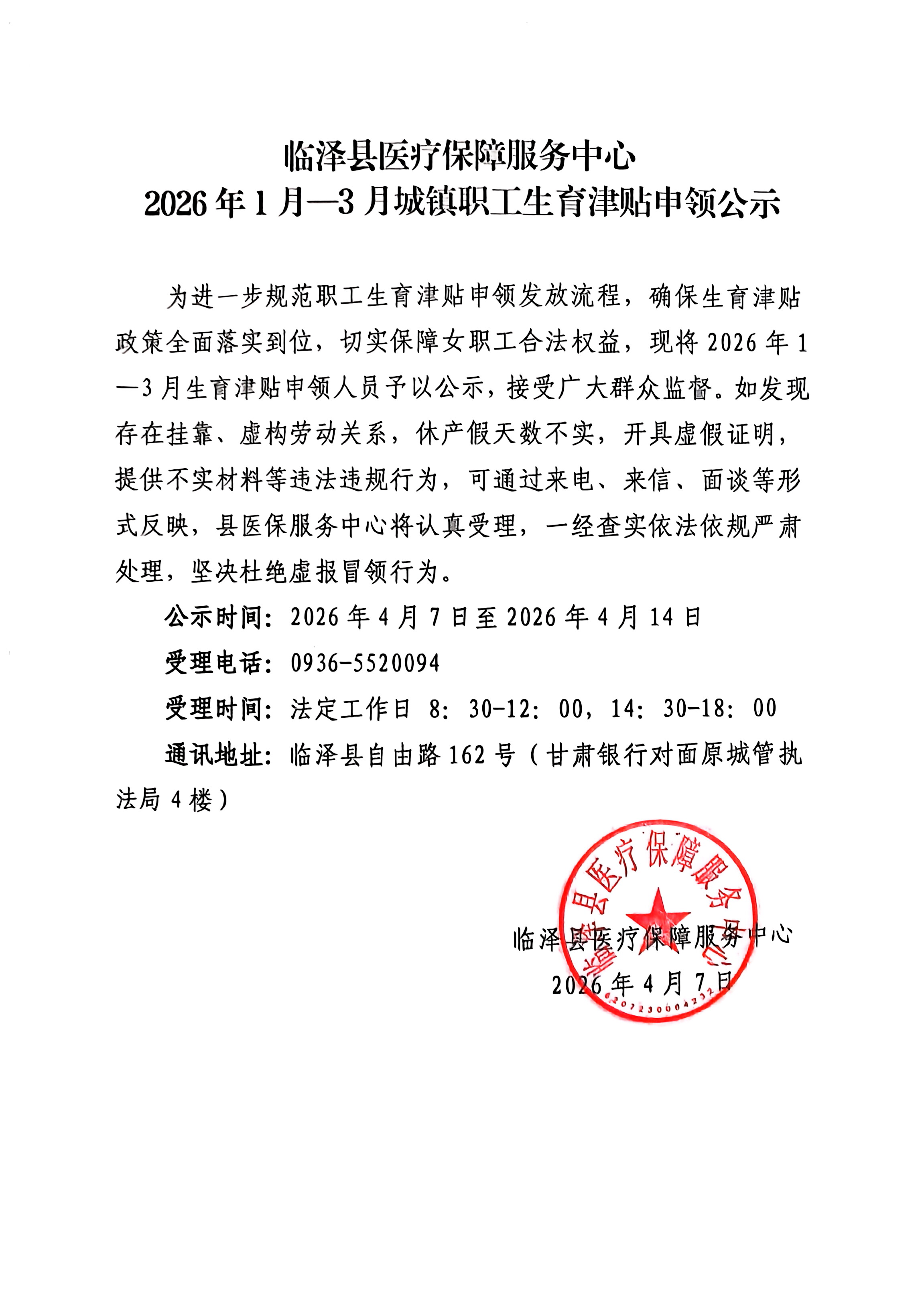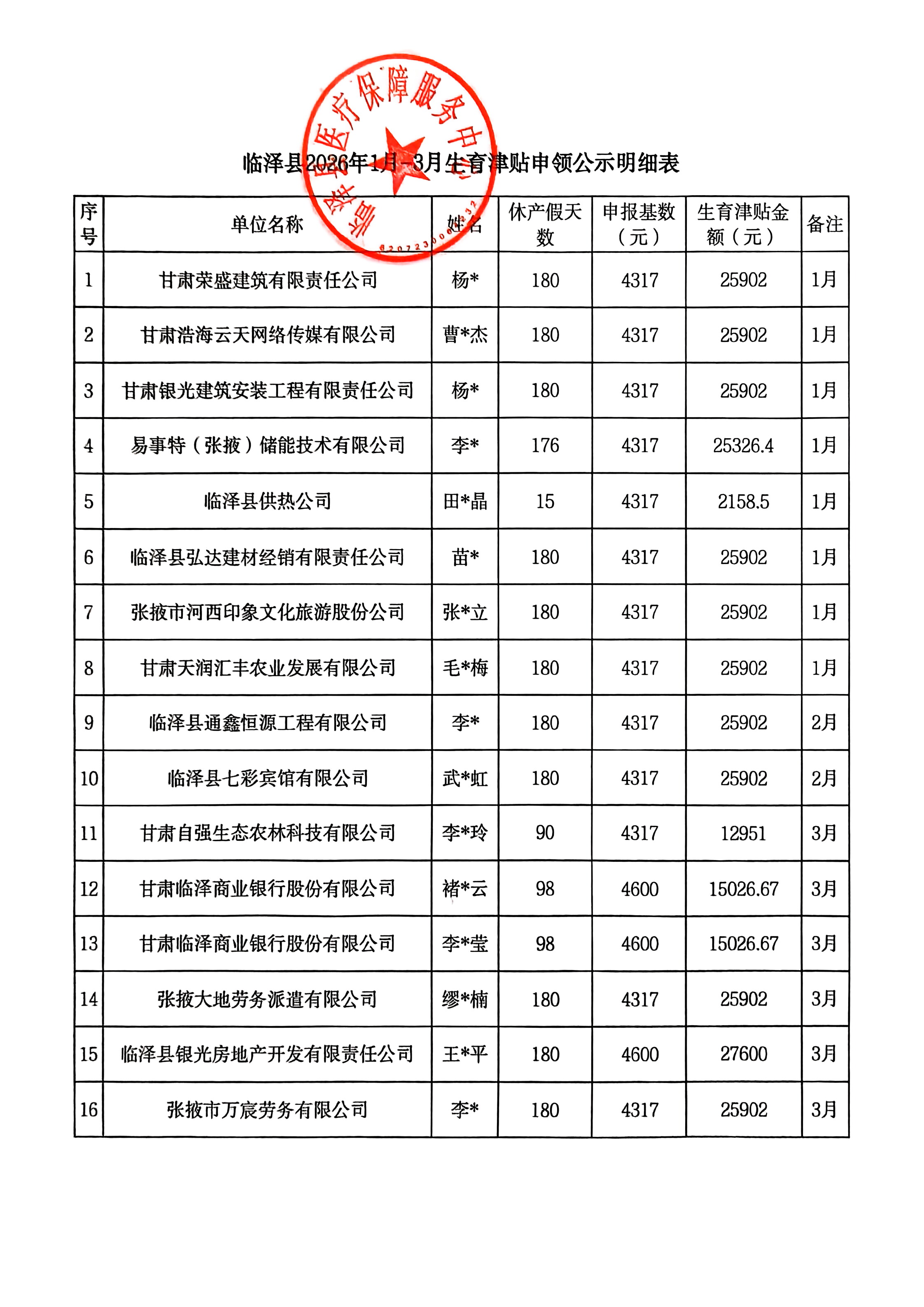 2026年1-3月城镇职工生育津贴申领公示