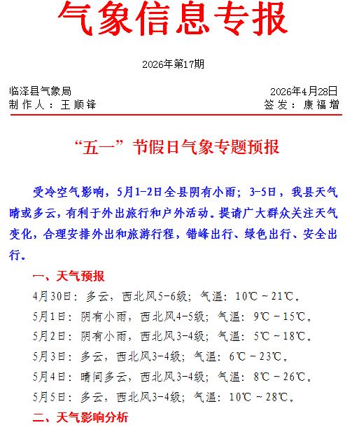 2026年4月28日气象信息专报(第17期)-“五一”节假日气象专题预报