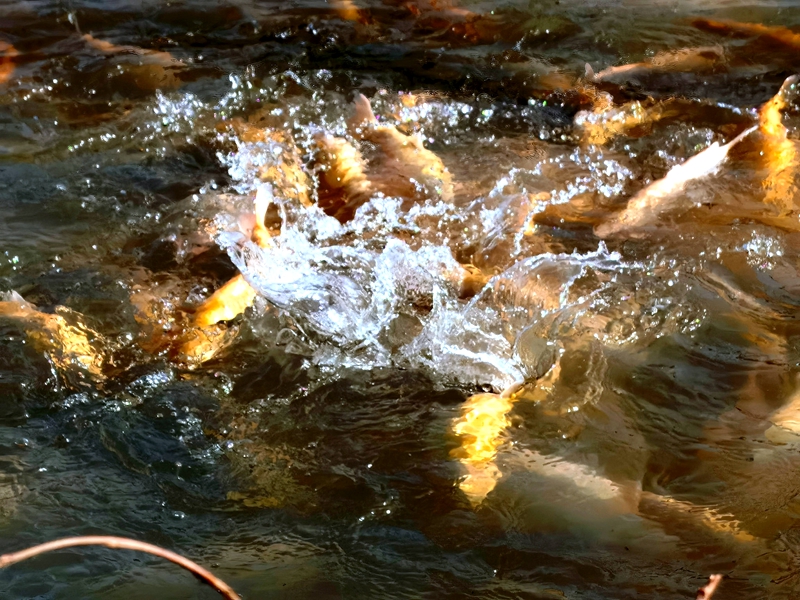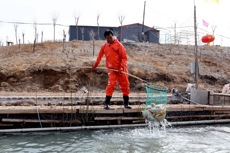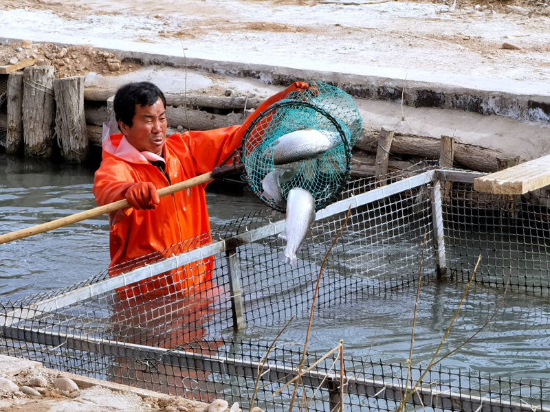 3月14日,走进临泽县新华镇大寨村九泉湾水产养殖基地,一尾尾金鳟鱼、虹鳟鱼正在觅食、嬉戏,不时跃出水面,溅起片片水花,负责人陈自定与工人正在给池里的鱼投食、供氧,忙得不亦乐乎。