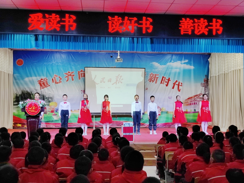 倪家营镇中心小学以“爱读书、读好书、善读书”为主题开展“红领巾开讲啦”大型思政金课,全体师生合唱红色歌曲《歌唱祖国》渲染爱党爱国氛围;情景剧《为中华之崛起而读书》展现百年风雨沧桑,引导孩子们珍惜国泰民安的读书环境;全校师生集体参与诗词“飞花令”,活跃现场氛围;校长与英语教师中英文朗诵《面朝大海 春暖花开》,为全校师生做阅读表率。系列活动的开展,有力推动了书香校园建设和读书活动深入开展。(智育海、王一捷)