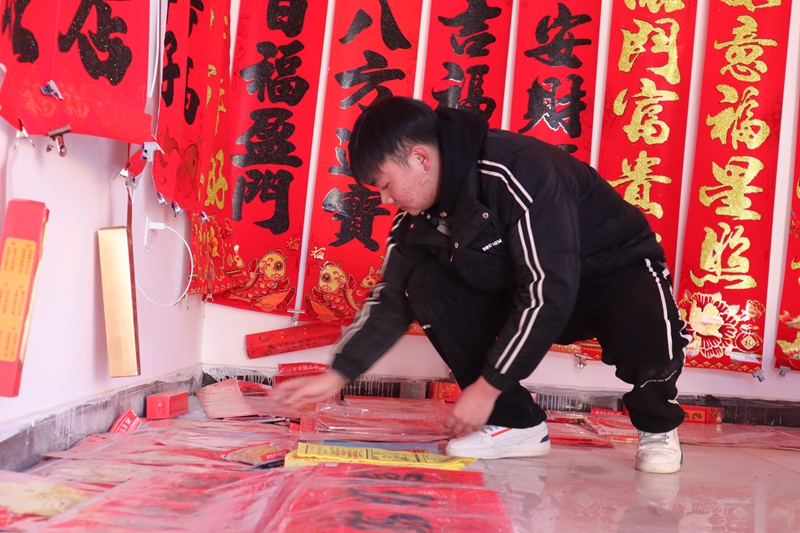 为迎接新年的到来,各种龙年的新春挂件、窗花、灯笼、对联已经开始热销。大学生蔡亮正摆弄着自家销售的对联,利用寒假假期,他帮家里售卖年货对联,生意非常红火。