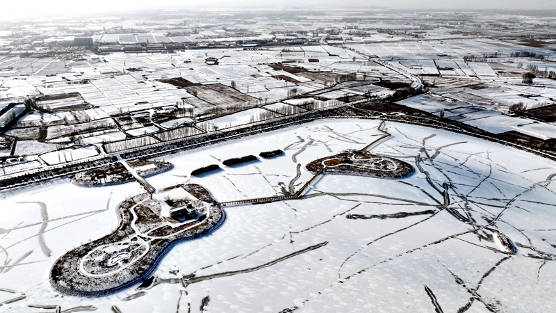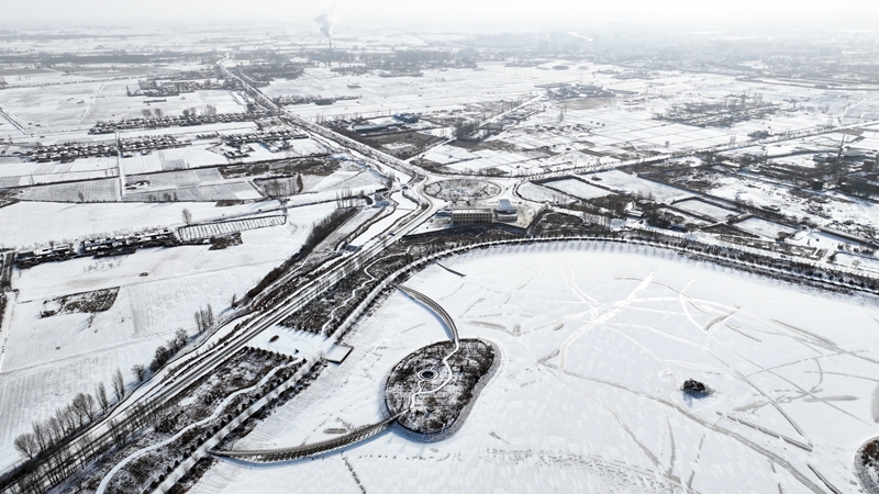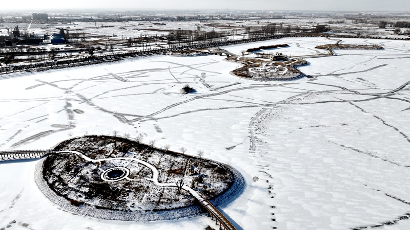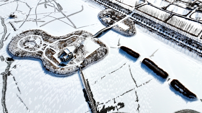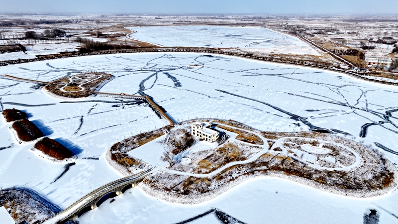 受强冷空气影响,2024年12月12日,甘肃省临泽县再次迎来降雪天气,飘扬的雪花将临泽县曹家湖装扮成银装素裹,湖面与桥崡相互交映,四处一片冰晶玉结,勾勒出了一幅西北河西走廊壮美自然的生态画卷。(安学海 摄)