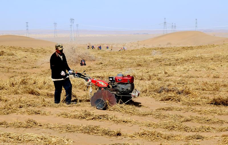 “一个治沙机可以顶20个人工,效益高,以前一个人(一天)种几分地,现在一个人(一天)可以做一亩。”治沙工人秦洋国说,别看这小小的手扶拖拉机其貌不扬,可是防沙治沙的“中流砥柱”。