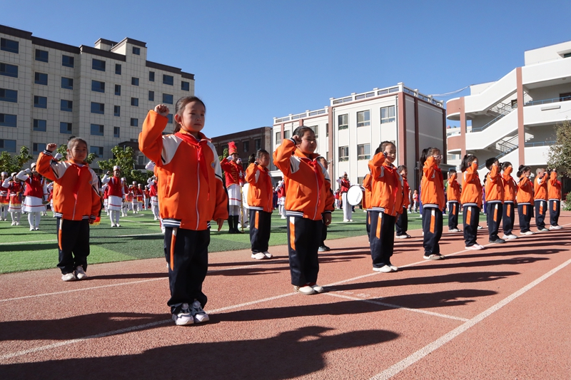 活动在庄严的国歌声中拉开帷幕,随后,由五三小学少先队员组成的鼓号队走上操场,以嘹亮的号声、整齐的鼓点、豪迈的步伐,展现新时代少先队员积极向上的精神风貌。紧接着,希望工程“1+1”资助仪式举行,为12名少年儿童争取1.2万元助学金,切实解决学业难题。资助仪式结束后,集中入队仪式按规范流程开展,20名少年儿童加入了少先队组织,成为了一名光荣的少先队员,队旗下他们用响亮的誓言表达了争当新时代好少年的决心。活动最后以特色表演《中国龙》收尾,彰显了少年儿童的活力与向上风貌。