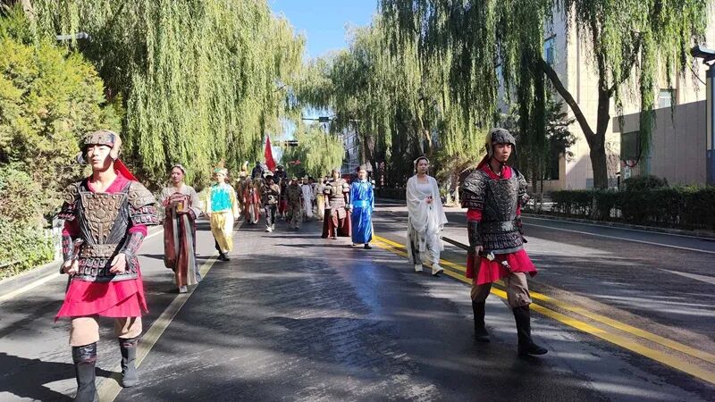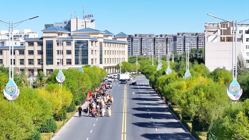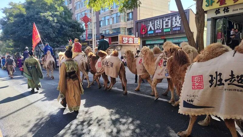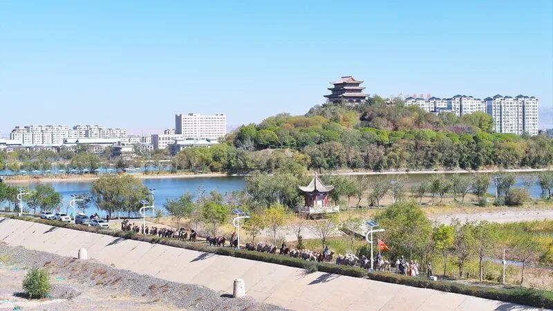驼铃声声里,队伍穿过县城沿流沙河景区继续前行,骆驼背上飘扬的彩旗与秋日景致相映成趣,成为临泽一道流动的文化风景。