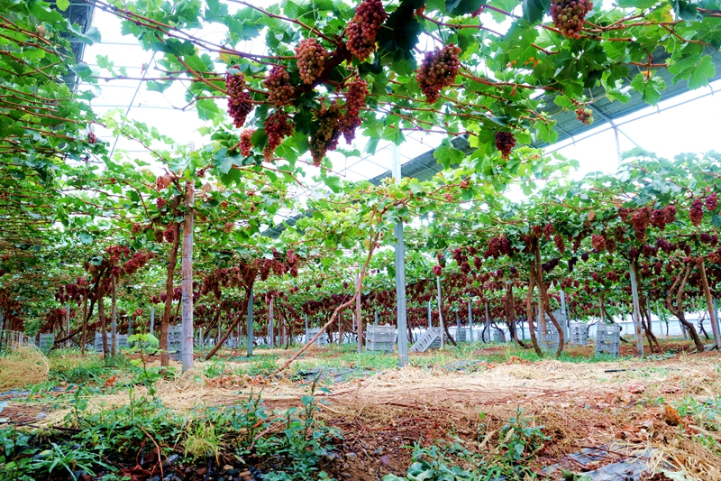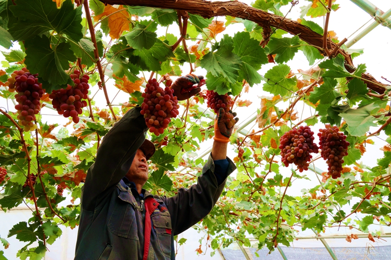 在设施大棚内,一串串晶莹剔透的“克瑞森”葡萄缀满枝头,饱满的果实散发着阵阵清香,让人垂涎欲滴。