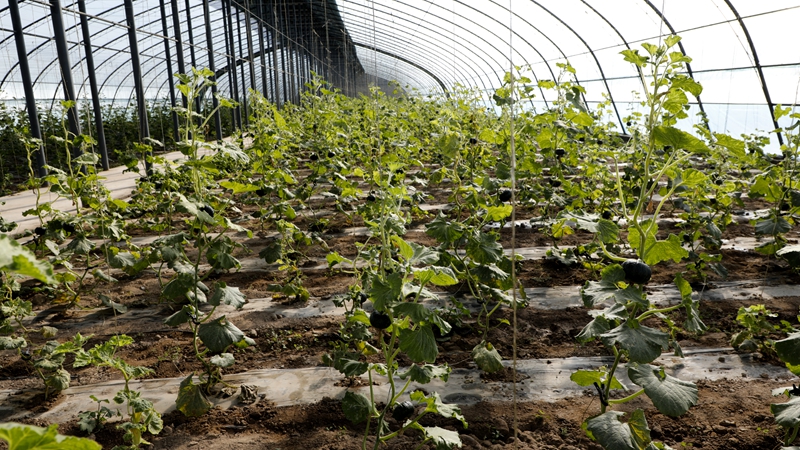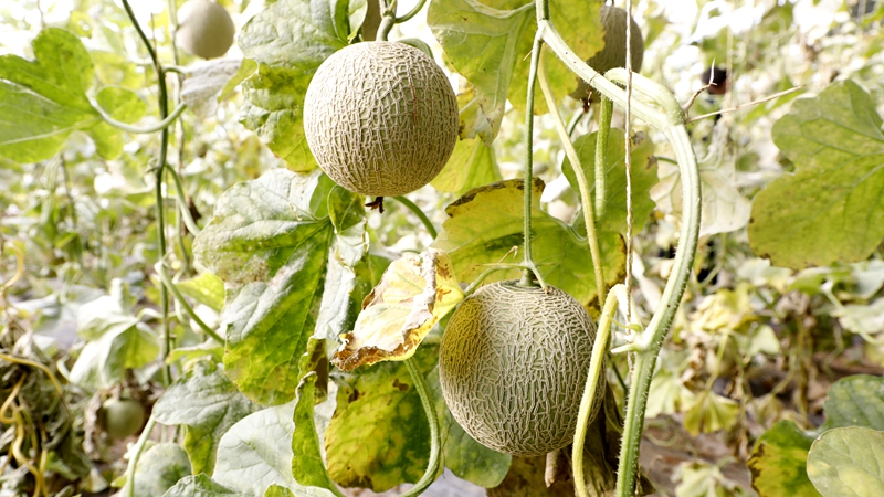 鸭暖镇古寨村党支部副书记王佳说:“我们今年引进了一个网纹蜜瓜的品种叫辛藤,它的特点是网纹状比较好看,果肉比较厚实,果香味也比较浓厚,我们这个棚目前面积是一点五亩,前期我们在七月底一个棚栽植了2700株,目前已经成熟了,长势比较好。”