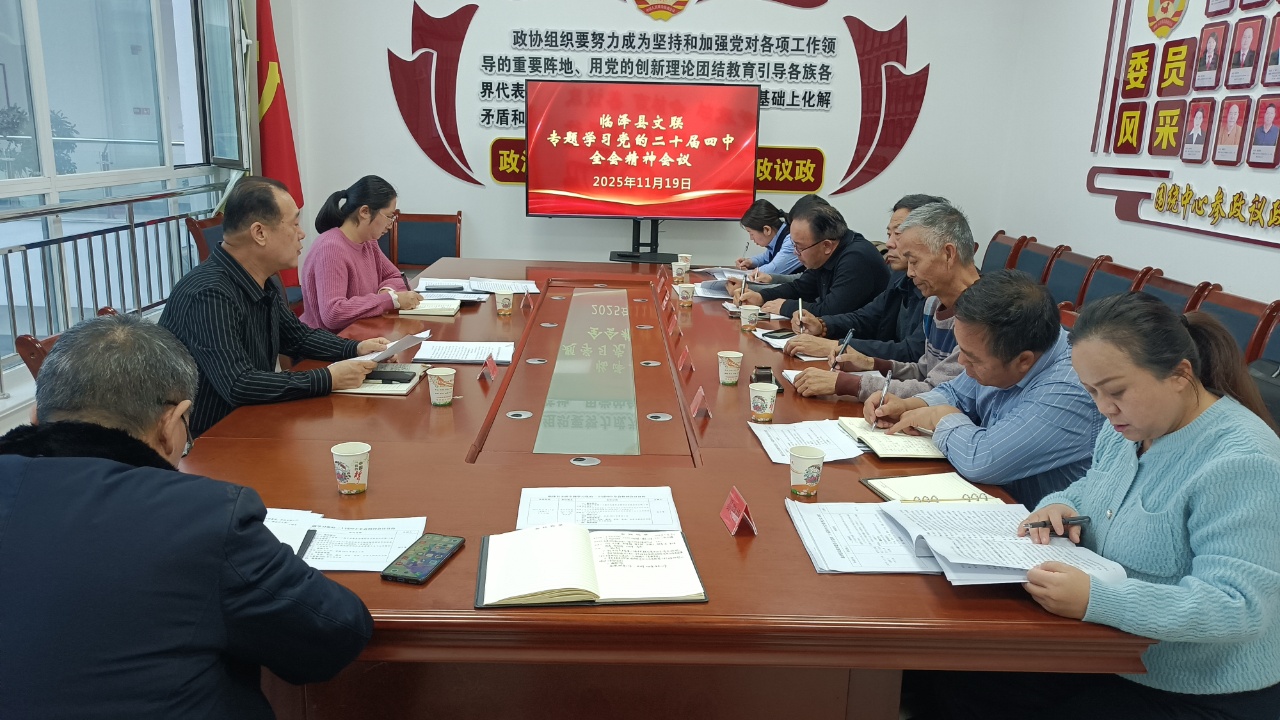 11月19日,临泽县文联召开专题学习党的二十届四中全会精神会议,传达学习党的二十届四中全会相关内容,通报县文联2025年工作,安排部署2026年重点,各文艺家协会和公安文联结合实际作交流发言。