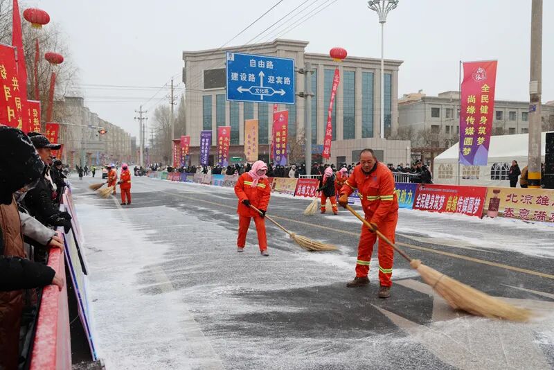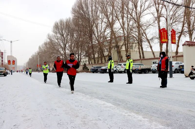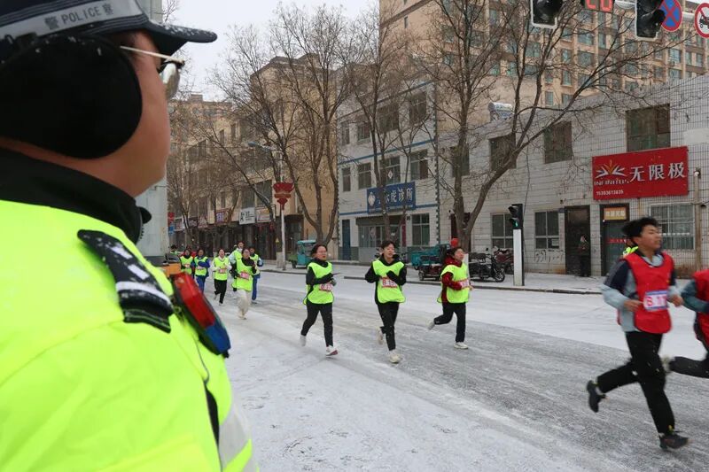 瑞雪纷飞,寒意袭人,1月1日 “奔跑吧・临泽” 第35届元旦环城赛如期开跑。为筑牢赛事安全防线,临泽县公安交警、医疗、环卫、志愿者等多部门联动协作、提前部署,在6.3公里赛道沿线织就一张立体保障网,用坚守与协同为1200余名选手的踏雪奔跑保驾护航。(汪永凡 李伟丽)