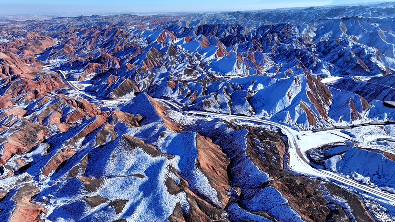 作为中国西北干旱区最典型的丹霞地貌代表,张掖七彩丹霞集丹霞、彩色丘陵与土林地貌于一体。元旦期间,雪覆丘陵,色彩更显浓艳纯净,宛如一幅巨型天然油画,令各地游客驻足赞叹。