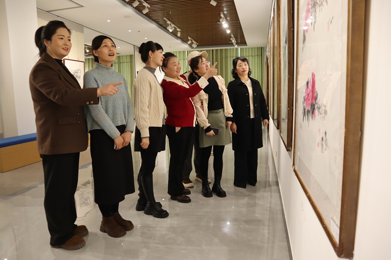 开幕式现场气氛热烈,培训班老师代表分享了教学心得,学员代表讲述了学习国画的收获与感悟。随后,书画爱好者们共同前往展厅参观展览,交流品评,感受水墨丹青间的意境与韵味。据悉,本次展览共征集培训班学员作品68幅,老师作品14幅,这些作品既是学员们对2025年美好学习时光的一次温暖总结,也是学员们用手中画笔弘扬中华优秀传统文化的集中展示。学员代表王瑛说:“今天看到我们自己创作的作品被展出,我感觉非常开心,也非常自豪,以后我也会更多参与这种活动。”