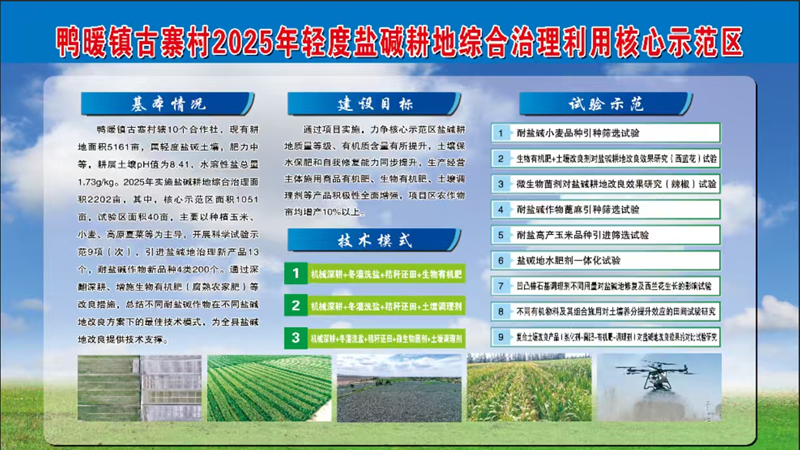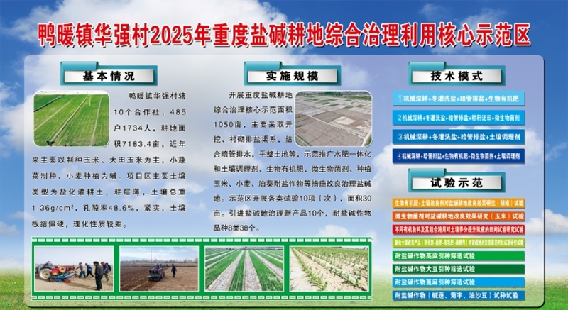 以种植玉米、辣椒等作物为主,改良治理重度盐碱地面积1050亩(鸭暖镇华强村),建立核心示范区面积1050亩,开展盐碱地改良产品效果对比研究等试验示范7项,建成高质量试验示范区45亩。项目区累计配发生物有机肥237.12吨、微生物菌剂5.16吨、土壤调理剂1.925吨。积极“暗管排盐+高量生物有机肥+特种改良剂+秸秆还田(农家肥)”、“冬灌洗盐+暗管排盐+土壤调理剂”等技术模式4项。同时,针对重度盐碱地治理难点,强化工程措施先导作用,在项目区埋设排水暗管18528米,集水管1529.1米,安装检查井2座,清理排阴沟446米,进一步筑牢改盐治碱基础,提升土壤改良成效。通过项目实施,项目区有机质增加0.04g/kg,水溶性盐减少1.333g/kg,粮食(玉米)亩均增产103.39公斤。