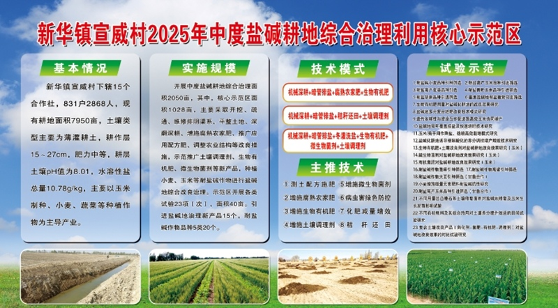 以种植玉米、小麦等作物为主,改良治理中度盐碱地面积3186亩(新华镇宣威村2050亩、富强村1136亩),建立核心示范区面积1028亩,开展耐盐胡麻品种引进筛选、耐盐食葵品种引进筛选等试验示范31项,建成高质量试验示范区74亩。项目区累计配发生物有机肥887.4吨,微生物菌剂17.704吨,土壤调理剂7.835吨,积极构建“暗管排盐+冬灌洗盐+生物有机肥(土壤调理剂)”“暗管排盐+腐熟农家肥+生物有机肥”等技术模式5项。通过项目实施,项目区有机质增加0.07g/kg,水溶性盐降低0.232g/kg,粮食(玉米)亩均增产83.48公斤。